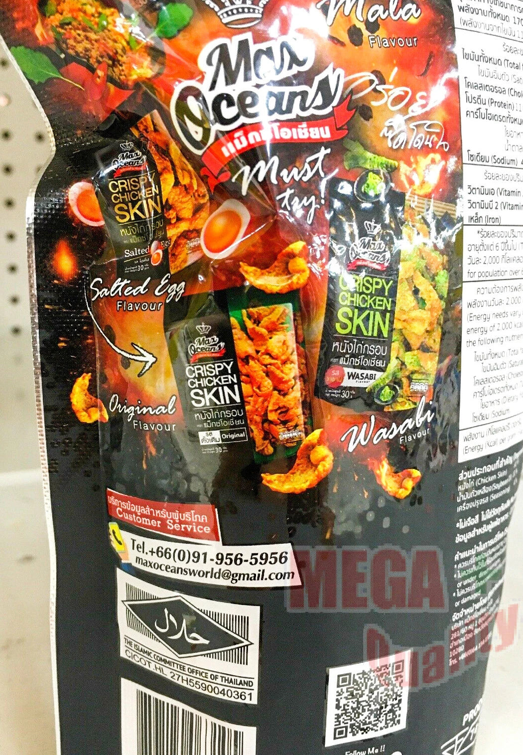 Max Oceans Crispy Chicken Skin in Mala Flavor is a savory Thai snack made from real chicken skin, fried until golden brown for an authentic crunch. Infused with spicy and numbing Szechuan Mala seasoning, this snack delivers a bold flavor experience. Each resealable pouch contains a protein-rich, zero-sugar treat that pairs perfectly with beer, salads, or noodles. It’s a must-have for spicy snack enthusiasts and is Halal certified for peace of mind.