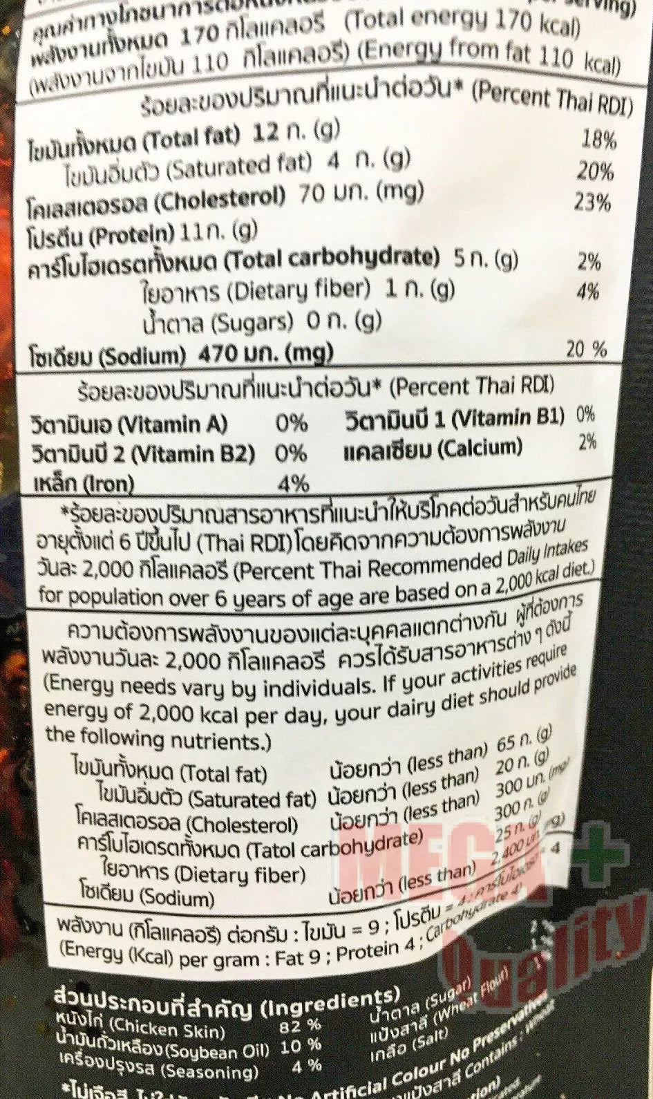 Chicken Skin (82%), Soybean Oil (10%), Seasoning Powder (Salt, Sugar, Chili, Garlic Powder, Pepper, Flavor Enhancers), Wheat Flour, Sugar. Contains Wheat and Soy.