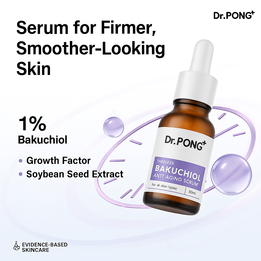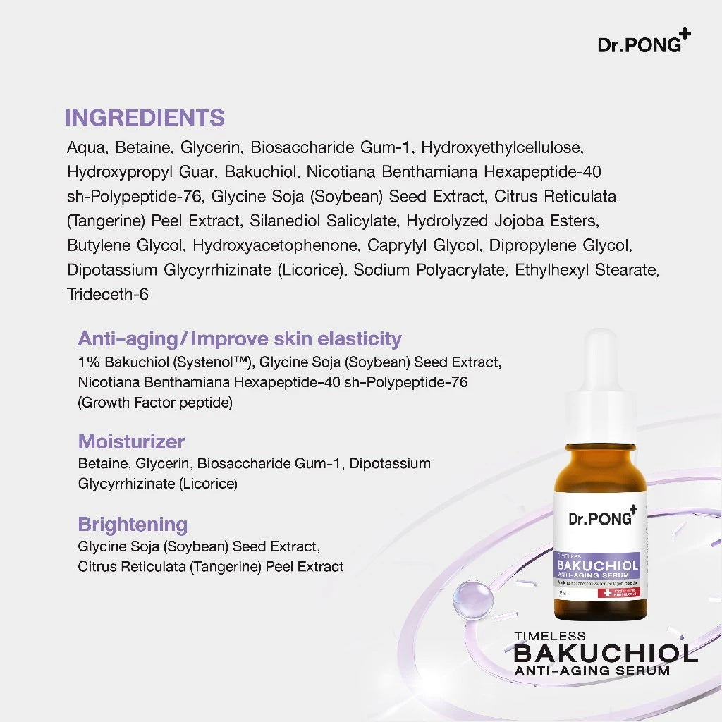 Reveal youthful, radiant skin with Dr.PONG Timeless Bakuchiol Anti-Aging Serum, a gentle yet powerful solution for age-defying skincare. This advanced formula features 1% Sytenol Bakuchiol, a plant-based alternative to retinol, designed to stimulate collagen production, reduce fine lines, and restore firmness—without the irritation commonly associated with retinoids.